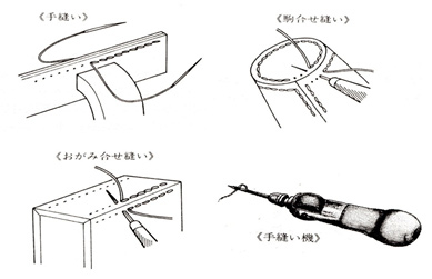 - 革などを糸で縫い合わせる技法。ち密な手作りの味わいのある製品ができる。基本的な技法に平縫い、すくい縫い、おがみ合わせ縫い、駒合わせ縫い(斜め縫い)がある。縫い目はミシン縫いと似ているが、上糸と下糸の区別がなく、上と下の糸が縫い穴で交互に入れかわる。