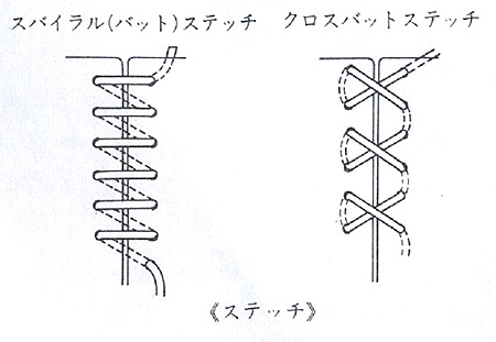 - 革ひもを使って革を縫い合わせる技法。革の縫製はミシン仕立てと手縫いであるが革手芸の良さを出すために革ひも(レース)を使って縫い合わせを行うもので、装飾を兼ねている。革に目打ちやハトメ抜きで必要な穴をあけ、レース針に革ひもをはさみ、これでかがる。巻きかがり、シングルステッチ、ダブルステッチ、フローレンスステッチ、ランニングステッチ、クロスステッチ、クロスバットステッチ(クロスとじ)、スパイラルス(バット)ステッチ(巻きとじ)などいろいろなかがりがある。